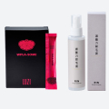 [原材料名] ガラクトオリゴ糖液糖(国内製造)、ブラックカラント果汁、アップル果汁、冬虫夏草エキス、豚胎盤エキス粉末、エクソソーム含有豚プラセンタエキス、デキストリン、ツバメ巣加工品(デキストリン、ツバメ巣)、エラスチン(魚由来)、バラ花びらエキス末、プロテオグリカン含有サケ鼻軟骨抽出物(デキストリン、サケ鼻軟骨抽出物)、酵母エキス、パイナップル果実抽出物(セラミド含有)/ゲル化剤(増粘多糖類)、pH調整剤、香料、甘味料(ステビア)、抽出ビタミンE、乳化剤(大豆由来)